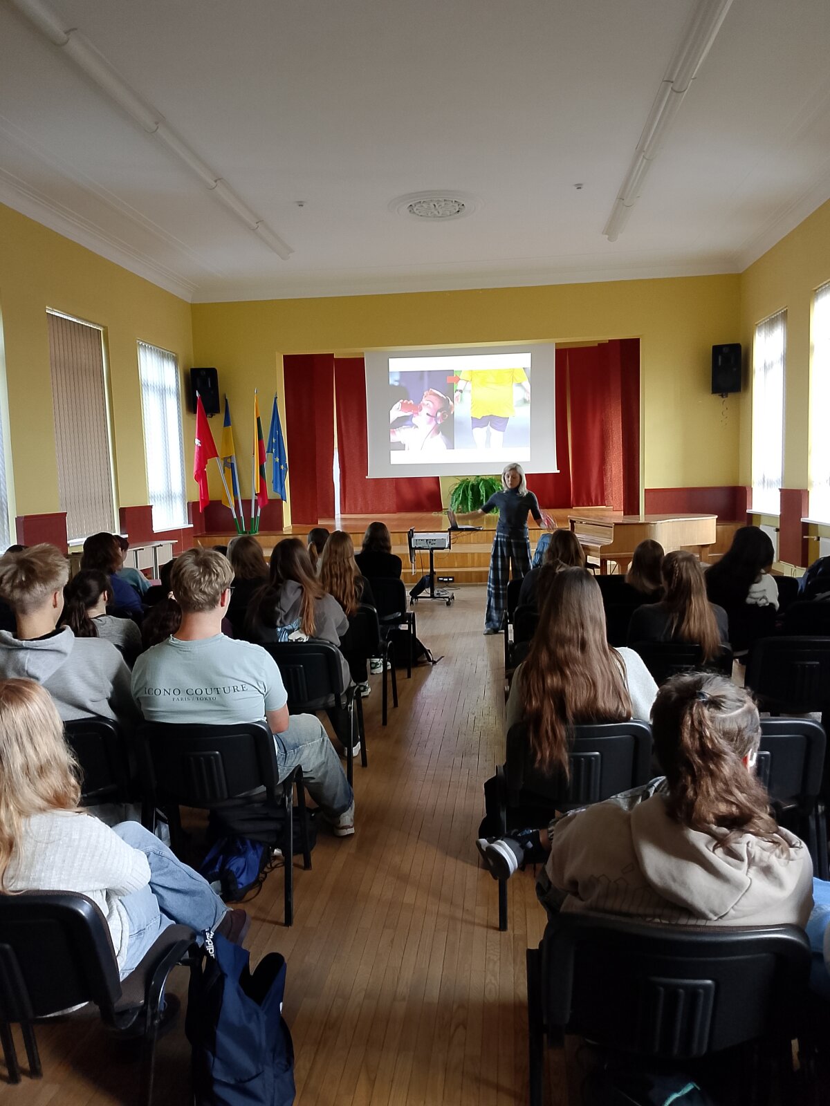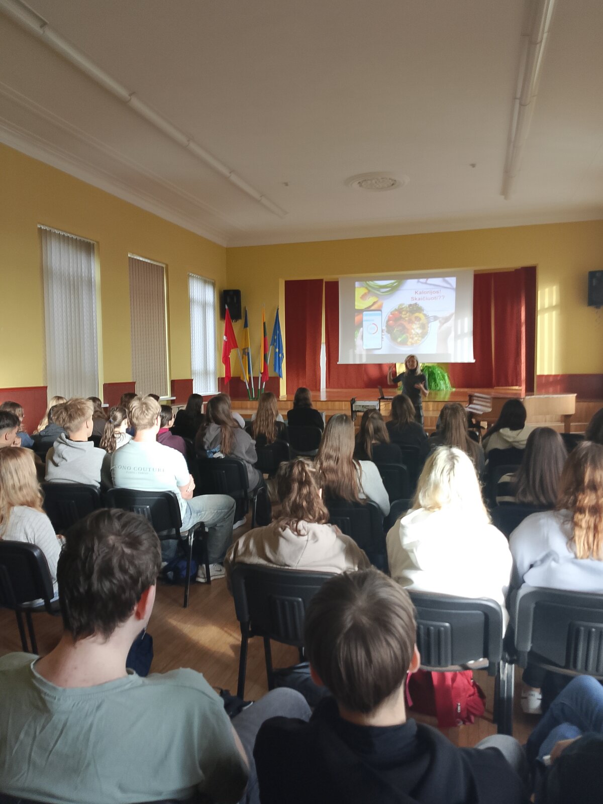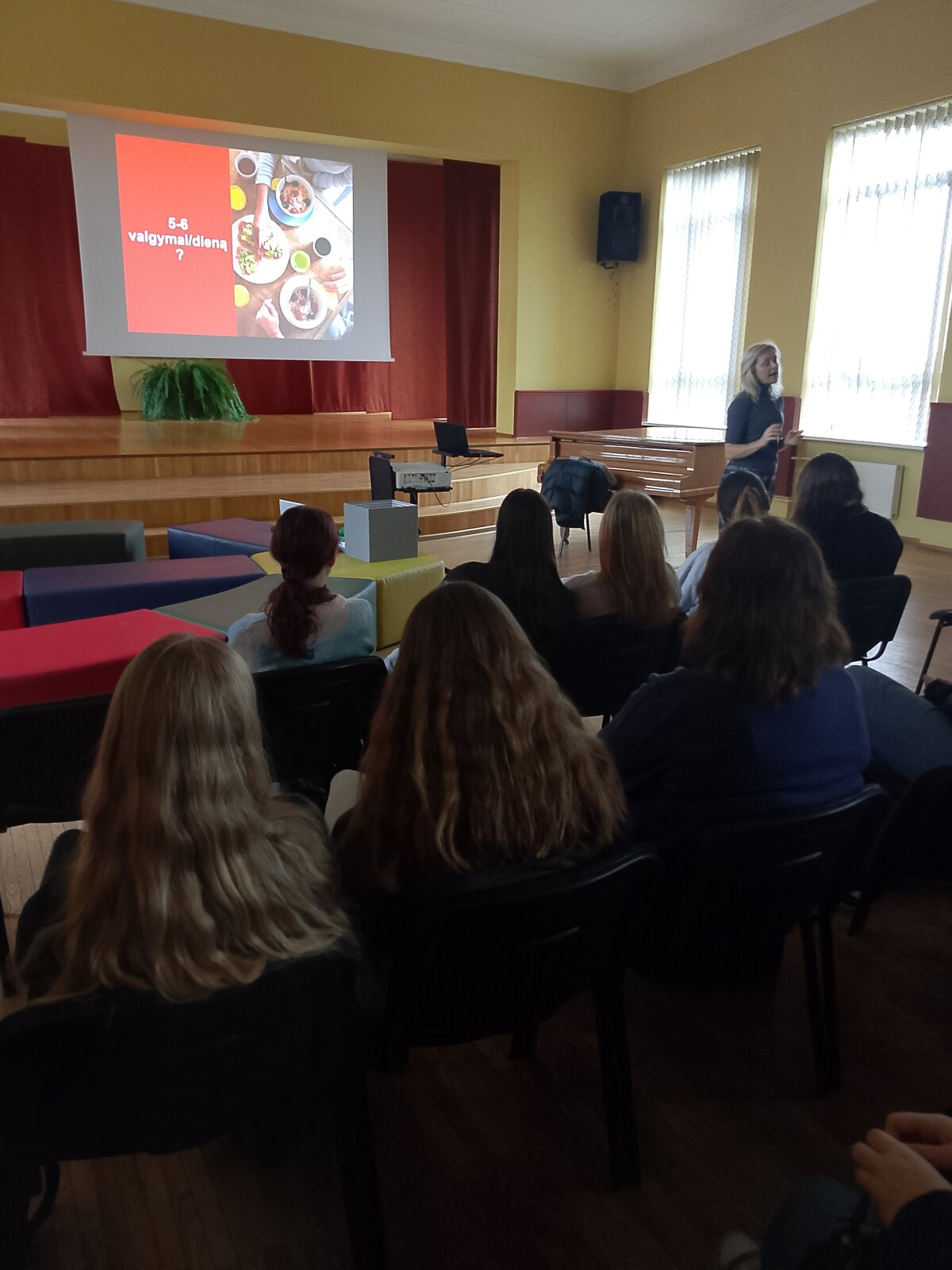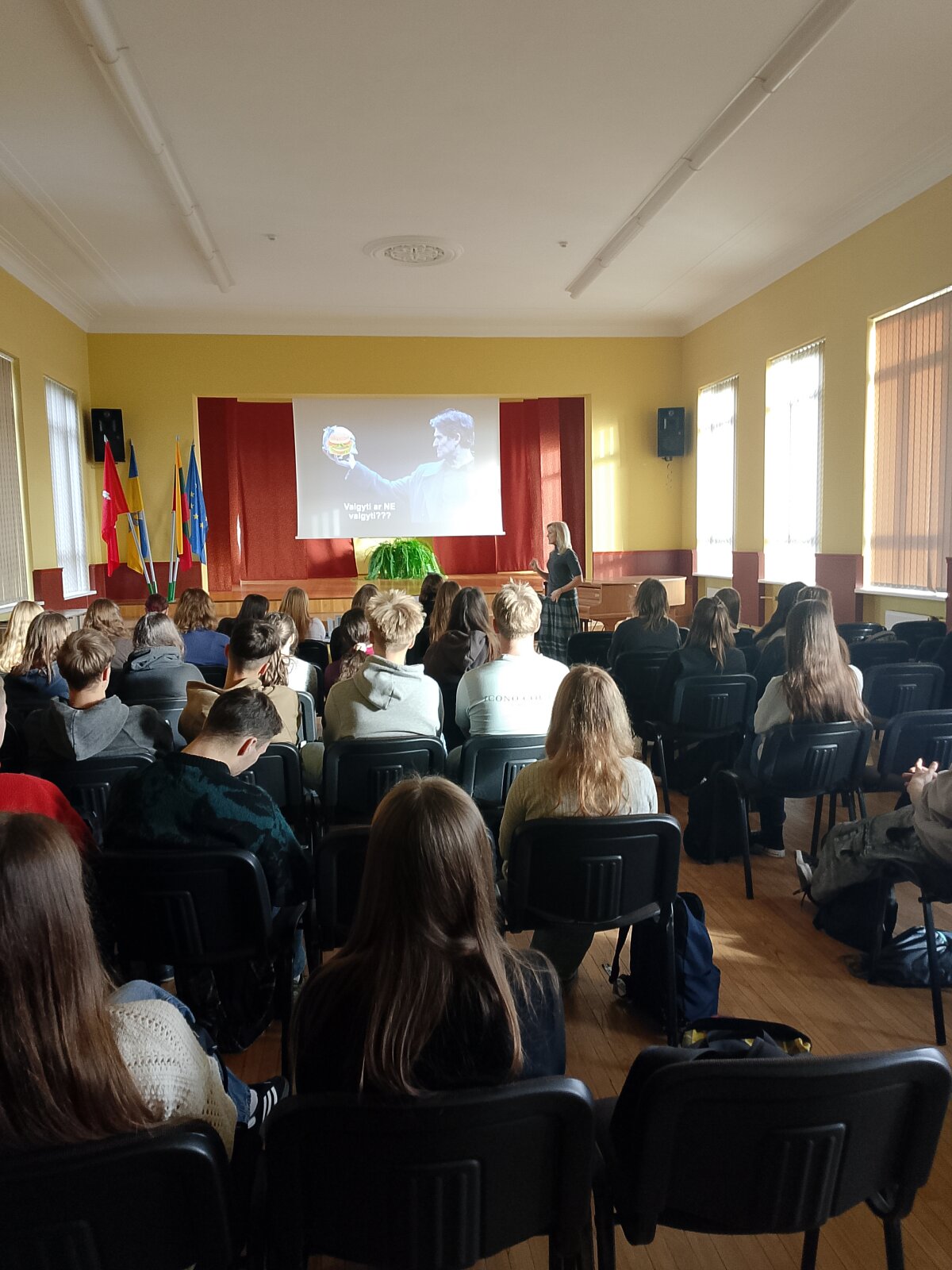 Į aktų salę gausiai susirinkusiems gimnazistams lektorė padėjo pažvelgti į savo lėkštę kaip į sveikatos šaltinį ir patarė, kokie produktai suteikia jėgų, stiprina organizmą ir padeda palaikyti gerą savijautą, bei pasakė daug praktinių patarimų.